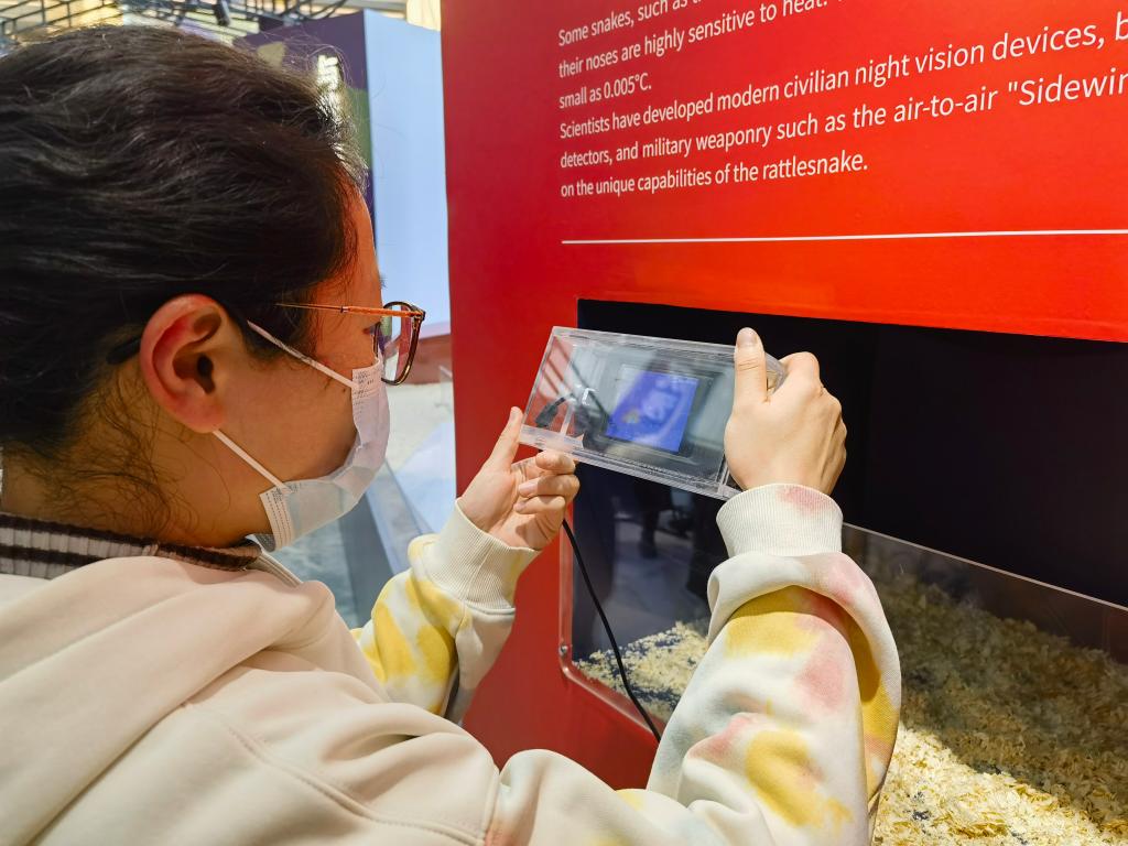 游客在上海自然博物館里通過(guò)紅外互動(dòng)裝置了解蛇如何“鎖定”獵物。新華社記者 陳愛平 攝