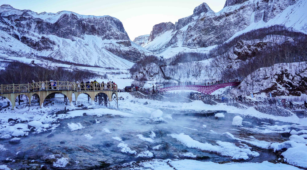 長(zhǎng)白山天池以北的延邊州,溫泉室外的樹(shù)枝上覆滿(mǎn)積雪,泡池內(nèi)滾燙的地?zé)嵩丛床粩唷I斐瞿_尖觸水,一股暖意傳遍全身。延邊云集安圖火山泉、龍井氟溫泉、延吉低氘溫泉等多種特色溫泉,吸引海內(nèi)外眾多游客慕名而來(lái)。