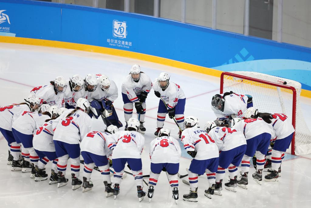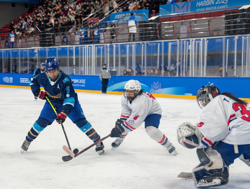 2月6日,在哈爾濱體育學(xué)院舉行的2025年第九屆亞冬會(huì)女子冰球小組賽B組比賽中,中國臺(tái)北隊(duì)1:5不敵哈薩克斯坦隊(duì)。新華社記者 孫非 攝