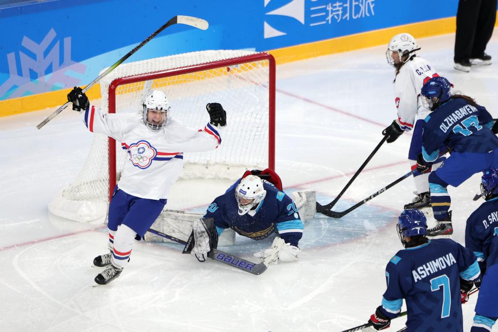 這里正在上演女子冰球B組一場焦點(diǎn)戰(zhàn),對陣雙方是中國臺(tái)北隊(duì)與哈薩克斯坦隊(duì),比賽開場第五分鐘,中國臺(tái)北隊(duì)就打入一球,進(jìn)球的68號(hào)球員雙臂高高舉起,和隊(duì)友一起慶祝,觀眾席傳來的,是山呼海嘯般的歡呼聲。