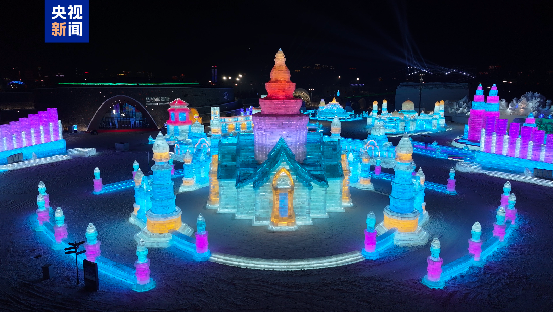 傍晚來臨,落日余暉中,一座座冰雕被點(diǎn)亮。夜幕降臨后,冰雕建筑群又迎來一場華麗轉(zhuǎn)變。