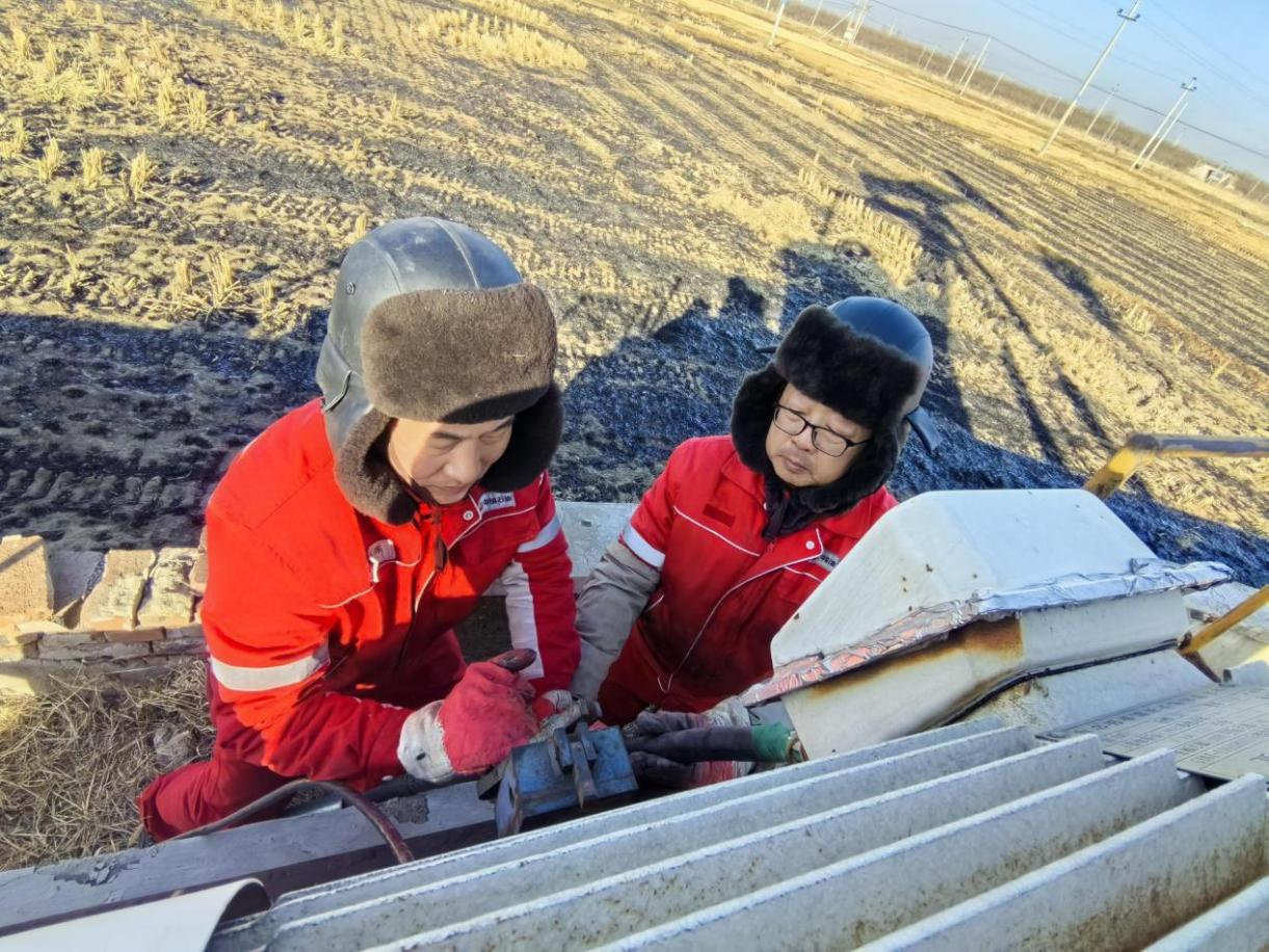 遼河油田員工馬雅輝(左一)和宮德偉(左二)正在為高2042井緊固皮帶。王麗莉攝