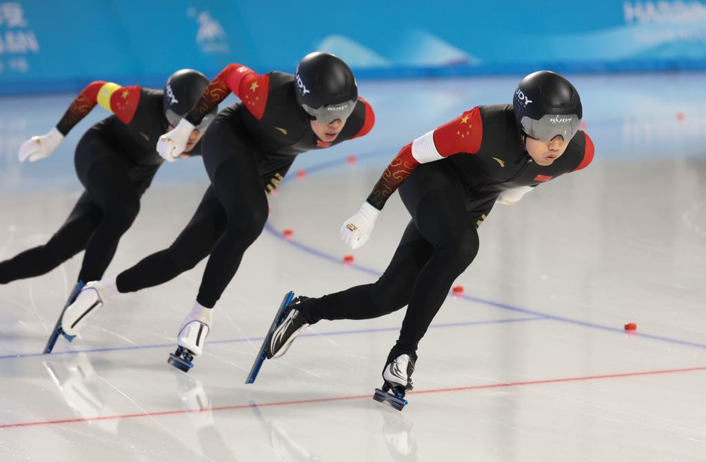 2月10日,中國(guó)隊(duì)選手高亭宇(右)、寧忠?guī)r、廉子文(中)在比賽中。當(dāng)日,第九屆亞冬會(huì)速度滑冰男子短距離團(tuán)體追逐賽在哈爾濱舉行。中國(guó)隊(duì)獲得冠軍。新華社記者 呂帥 攝