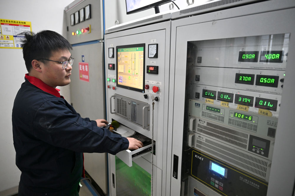 1月8日,在河南省科學(xué)院(沁陽)科創(chuàng)園,焦作同輻科技有限責(zé)任公司工作人員查看電子加速器系統(tǒng)運(yùn)行狀態(tài)。