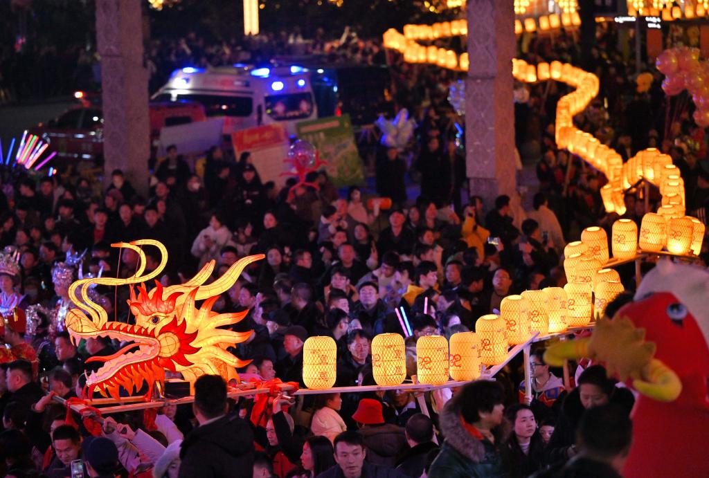 2月11日晚,人們?cè)谂_(tái)江縣參加“舞龍噓花”活動(dòng)。新華社記者 陶亮 攝