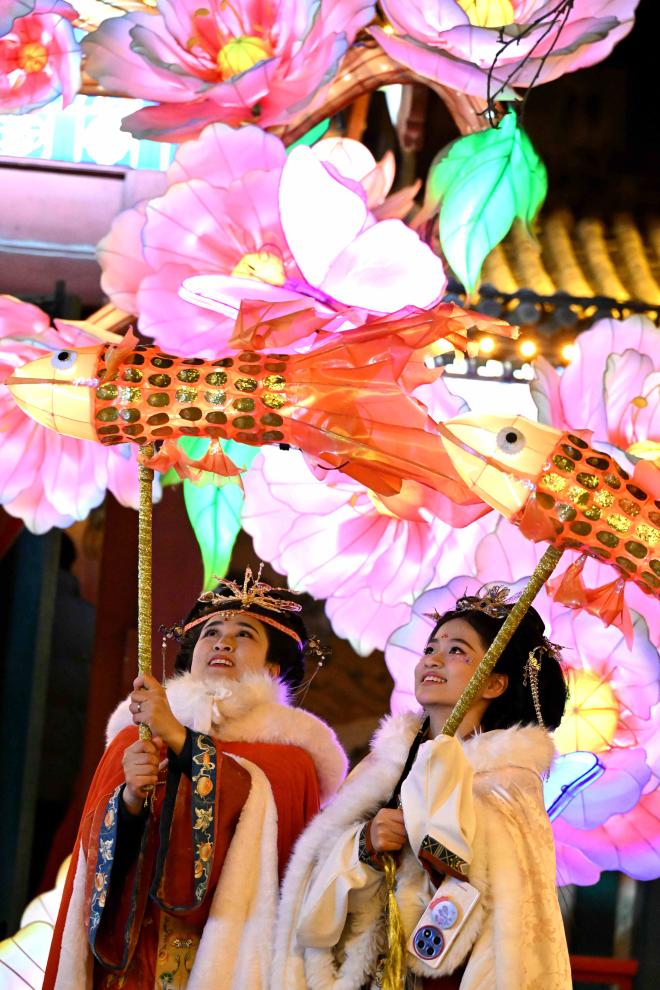 2月8日晚,身著傳統(tǒng)服飾的游人在河北省石家莊市正定榮國(guó)府影視基地內(nèi)游園賞花燈。新華社發(fā)(陳其保攝)