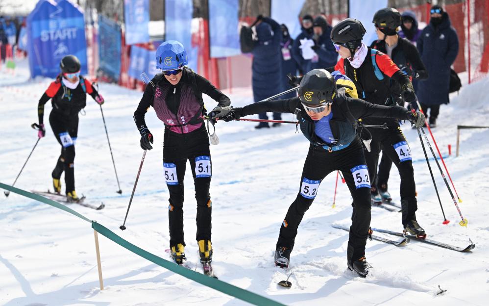 2月12日,次旦玉珍(前左)/布魯爾在比賽中交接棒。當日,第九屆亞冬會滑雪登山混合接力決賽在亞布力舉行。中國組合次旦玉珍/布魯爾、于婧萱/畢禹新、索朗曲珍/劉建賓分別獲得冠、亞、季軍。新華社記者 謝劍飛 攝