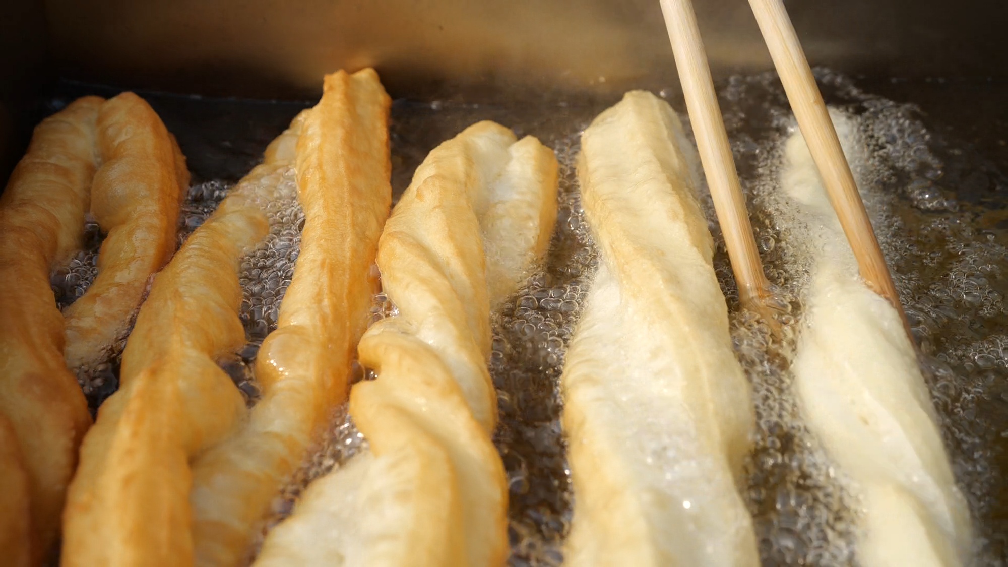 史梅菊賣(mài)早餐賣(mài)了二三十年,今年她和小叔子江新軍代表江莊村參賽。為防止面團(tuán)粘連,史梅菊用搟面杖在油鍋里沾點(diǎn)油后,再把面團(tuán)搟成長(zhǎng)面餅狀。用刀快速切條,兩個(gè)面餅條疊在一起,史梅菊再用手摁壓幾下,給油條在鍋里留足發(fā)酵空間,以此保持油條的蓬松感。江新軍負(fù)責(zé)不停地翻轉(zhuǎn)鍋里的油條。
