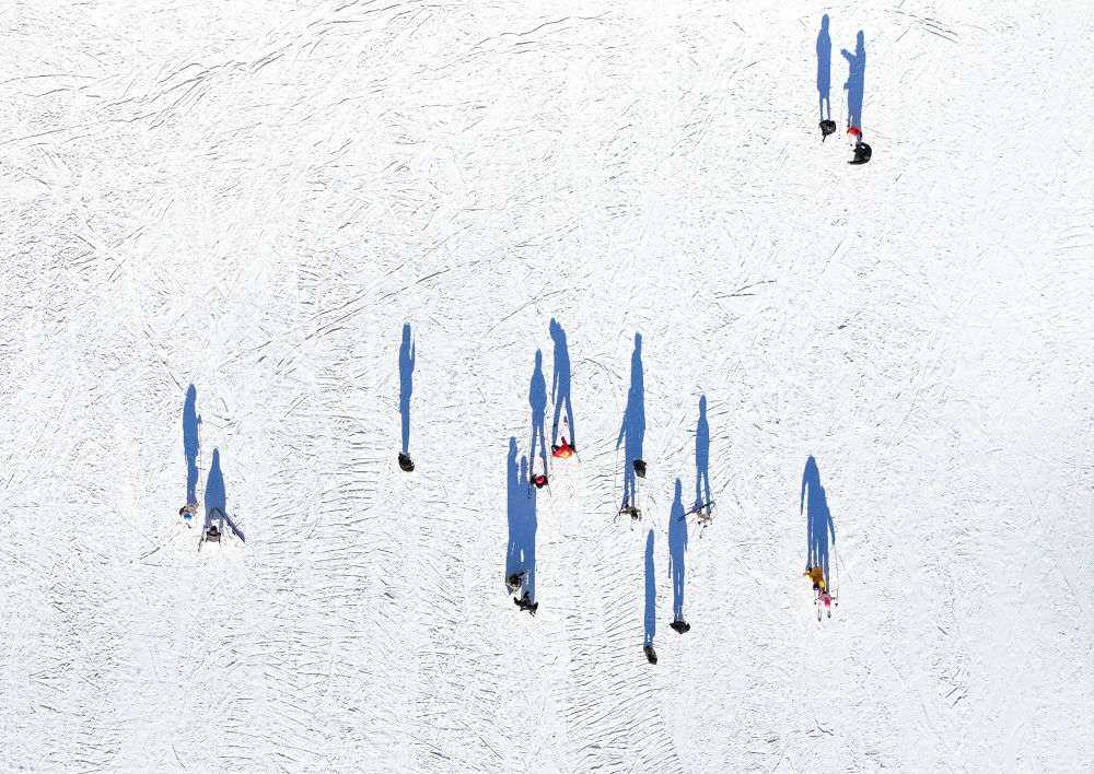 滑雪愛(ài)好者在內(nèi)蒙古呼倫貝爾扎蘭屯市金龍山滑雪場(chǎng)滑雪(無(wú)人機(jī)照片)新華社記者連振 攝