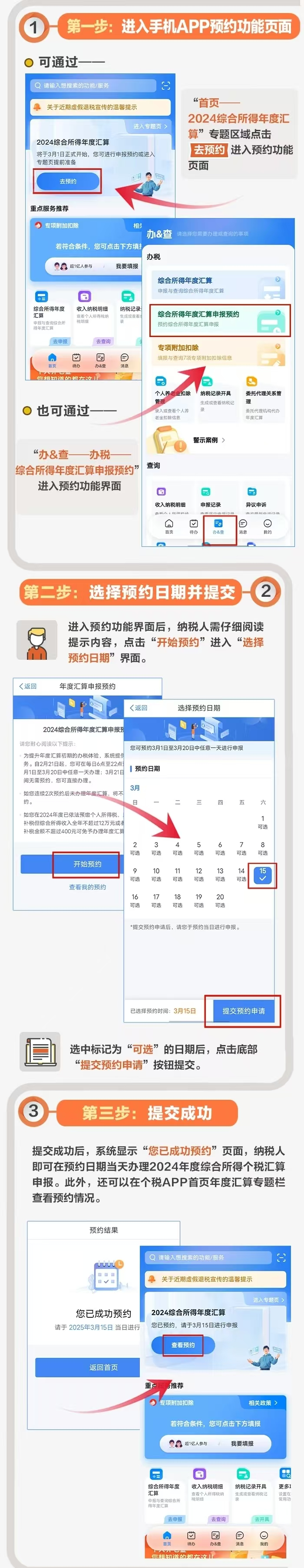 如需在3月1日至3月20日之間辦理年度匯算,可在2月21日至3月20日每天6時(shí)至22時(shí)登錄手機(jī)個(gè)人所得稅APP進(jìn)行預(yù)約。
