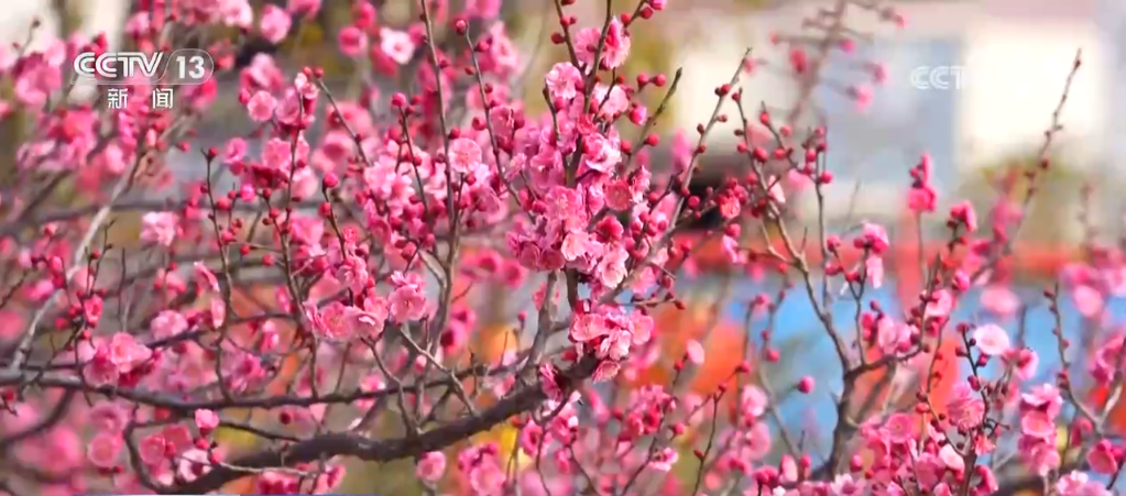 同樣,在甘肅隴南市武都區(qū),濕地公園內(nèi)的梅花也競(jìng)相綻放,粉紅相間的花朵掛滿枝頭,幽香彌漫在空氣中,引來蜜蜂翩翩起舞。