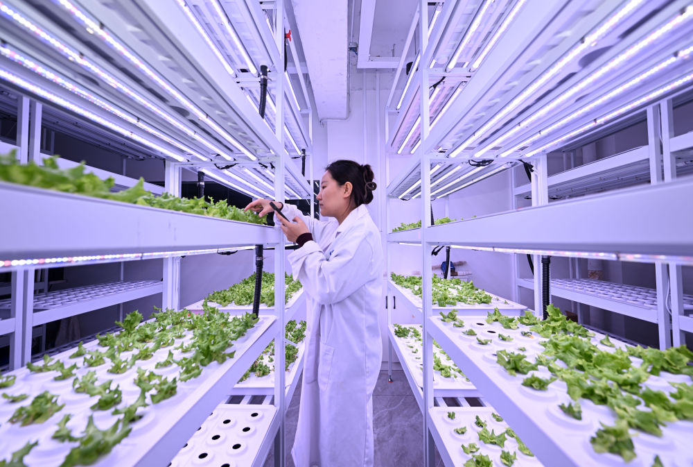 科芯(天津)生態(tài)農(nóng)業(yè)科技有限公司工作人員在實(shí)驗(yàn)室查看農(nóng)作物生長(zhǎng)情況。 新華社記者 趙子碩 攝