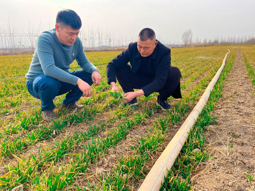 山東省嘉祥縣金屯鎮(zhèn)賀李胡村種糧大戶張春杰(左一)正在和村干部一同查看麥苗長勢。(受訪對象供圖)
