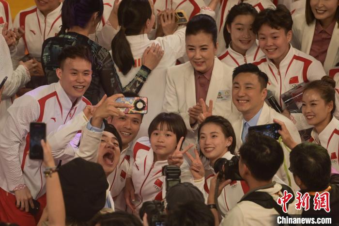 2024年8月30日,訪(fǎng)港的中國(guó)內(nèi)地奧運(yùn)健兒出席奧運(yùn)健兒大匯演。圖為香港藝人與奧運(yùn)健兒自拍。 中新社記者 陳永諾 攝