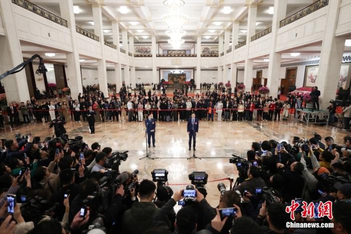 3月5日,十四屆全國人大三次會(huì)議首場“代表通道”集中采訪活動(dòng)在北京人民大會(huì)堂舉行。全國人大代表、小米集團(tuán)創(chuàng)始人、董事長兼首席執(zhí)行官雷軍(右)、全國人大代表、海爾集團(tuán)董事局主席、首席執(zhí)行官周云杰接受采訪。中新社記者 富田 攝