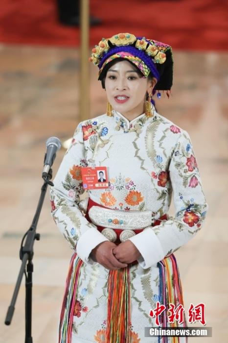 全國人大代表、四川省馬爾康市養(yǎng)護(hù)院院長格西王姆接受采訪。中新社記者 富田 攝
