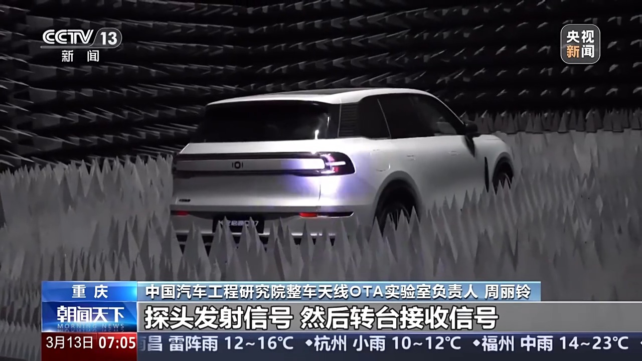 中國(guó)汽車工程研究院整車天線OTA實(shí)驗(yàn)室負(fù)責(zé)人 周麗鈴:這里是我們的一個(gè)探頭,然后配我們的轉(zhuǎn)臺(tái),探頭發(fā)射信號(hào),然后轉(zhuǎn)臺(tái)接收信號(hào),這樣的話就可以測(cè)汽車的接收性能,那它們互換一下就可以測(cè)汽車的一個(gè)發(fā)射的性能。