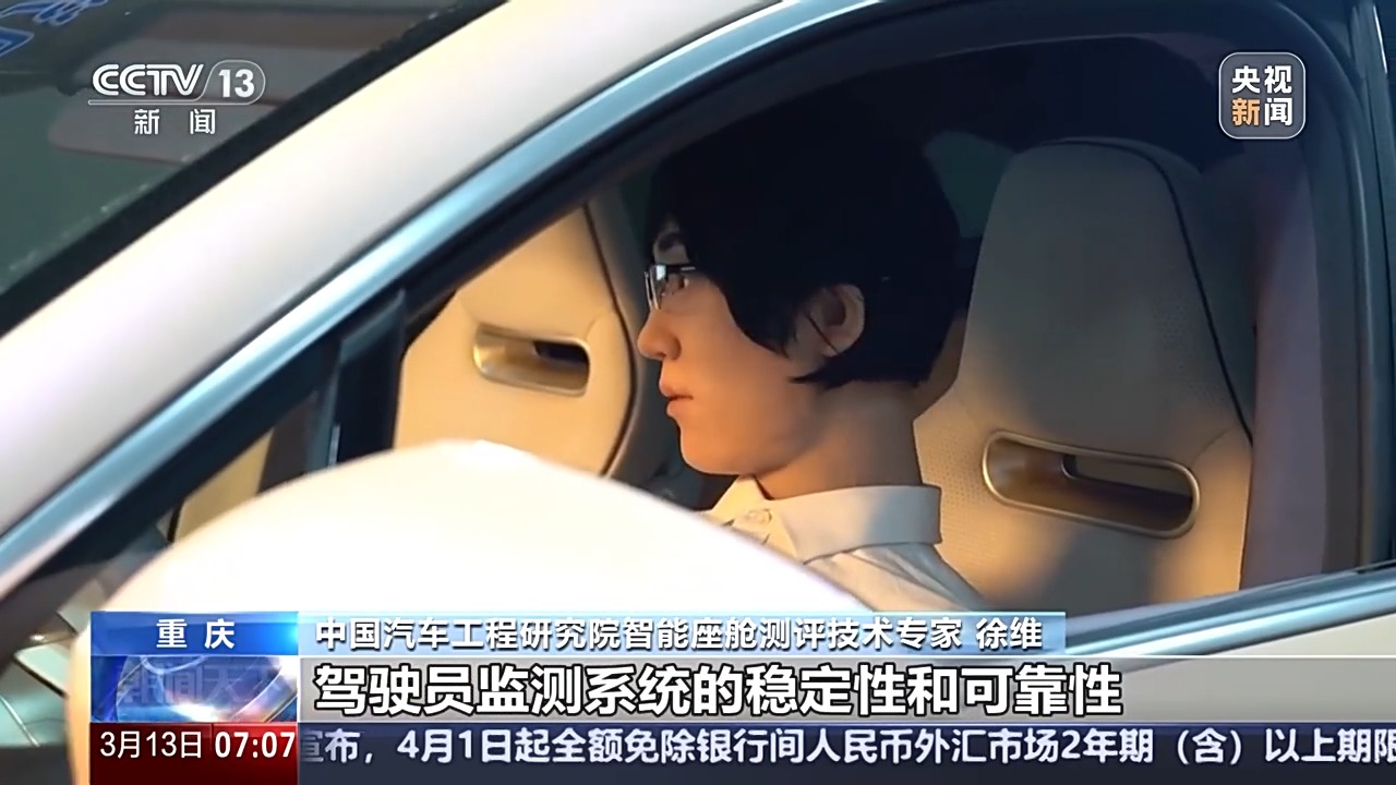 中國(guó)汽車工程研究院智能座艙測(cè)評(píng)技術(shù)專家 徐維:這個(gè)仿生機(jī)器人可以去模擬駕駛員的一些手勢(shì)動(dòng)作,同時(shí)可以模擬我們眨眼睛、微笑等一些微表情,從而快速去檢測(cè)我們駕駛員監(jiān)測(cè)系統(tǒng)的穩(wěn)定性和可靠性。