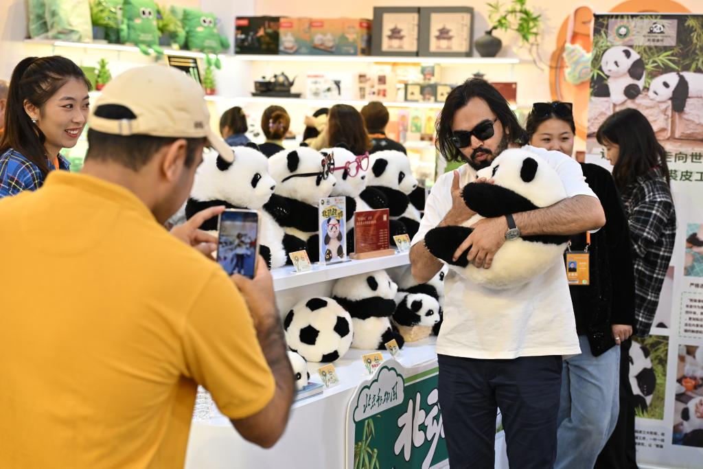 2024年9月16日,參觀者在2024年服貿(mào)會首鋼園區(qū)文旅服務專題展區(qū)抱著北京動物園推出的大熊貓文創(chuàng)玩偶合影。新華社記者 李鑫 攝
