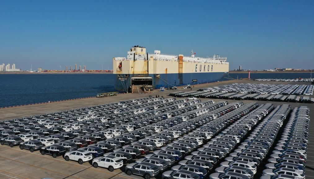 2025年2月25日,來自京津冀地區(qū)的超4000輛國產(chǎn)自主品牌汽車在天津港環(huán)球滾裝碼頭等待裝船發(fā)往海外(無人機照片)。新華社記者 趙子碩 攝