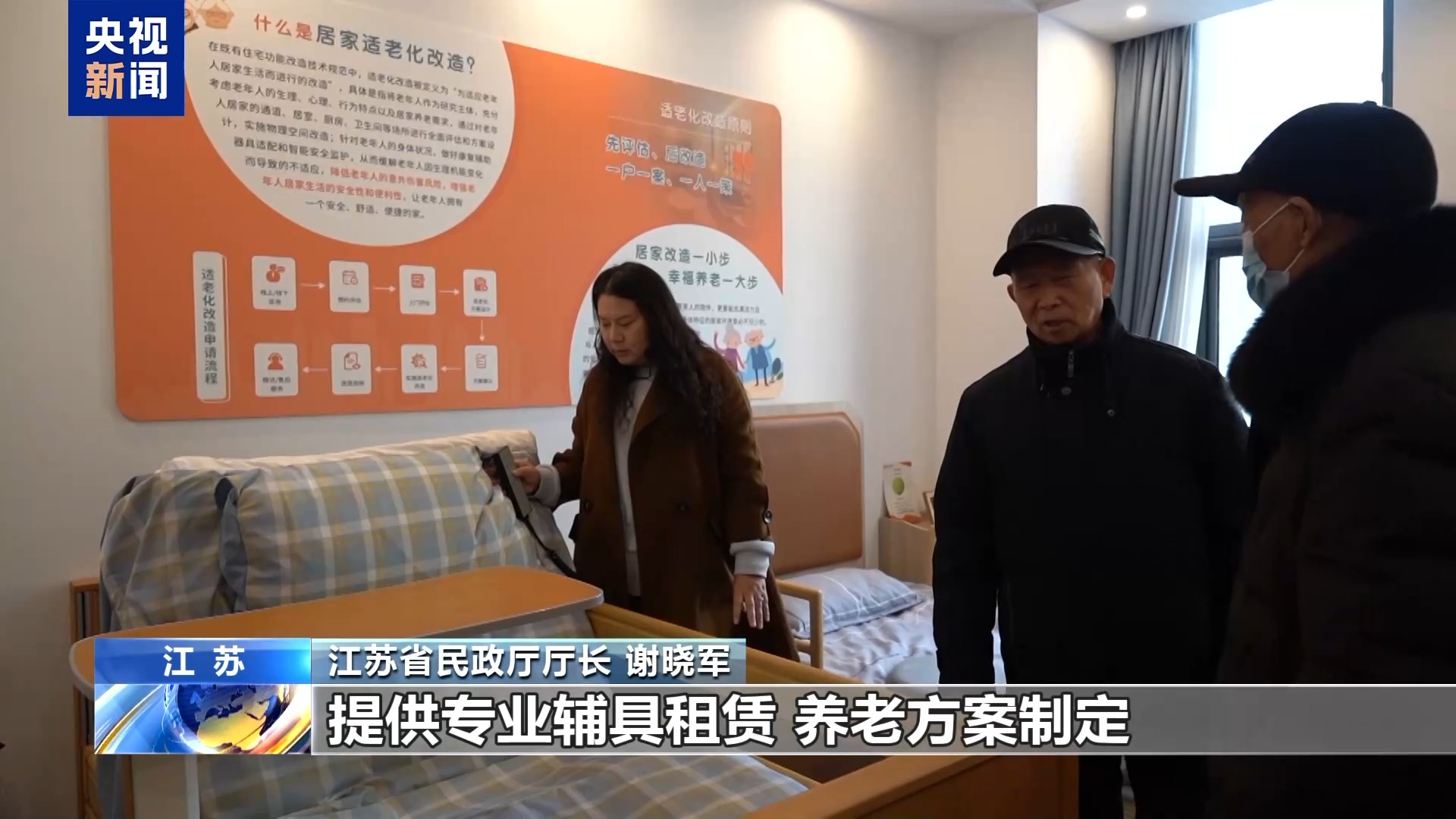 江蘇省民政廳廳長 謝曉軍:提供專業(yè)輔具租賃、養(yǎng)老方案制定,持續(xù)推廣助潔、助浴、助醫(yī)、助行等上門服務。把老年人日常、急需的養(yǎng)老服務送到家里,打造老年人身邊的“一站式”養(yǎng)老服務平臺。