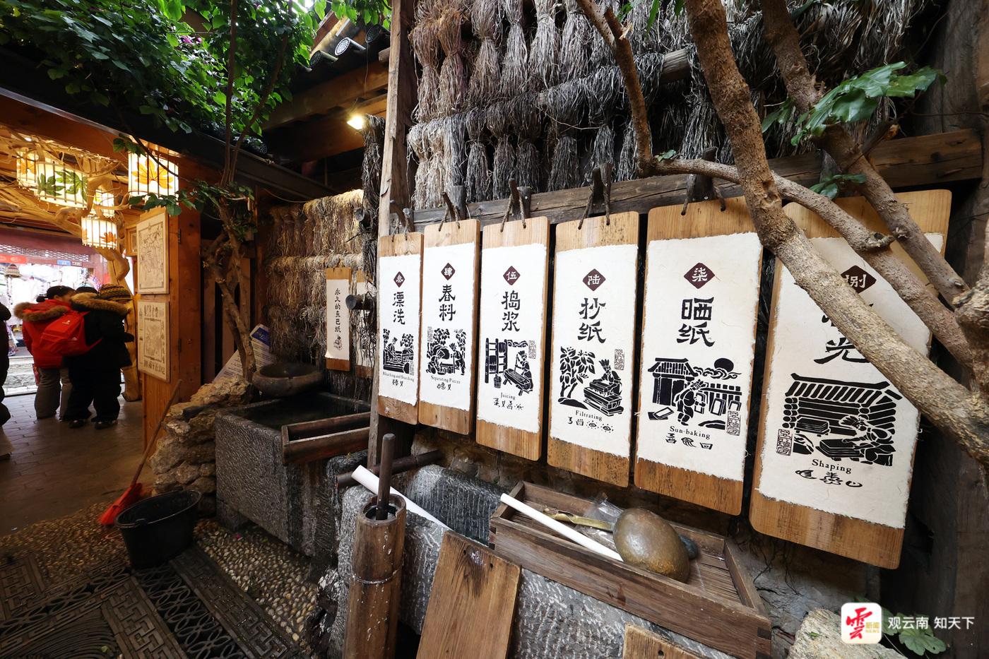 麗江古城內(nèi)以東巴文化體驗(yàn)為亮點(diǎn)的“東巴紙坊”吸引著許多中外游客。在這里,游客們可以體驗(yàn)到搗漿、抄紙、曬紙等東巴紙制作工藝,還能拿起東巴象形文字印章集章打卡。如果你好奇某個象形文字的含義,還能在這里買到一本東巴文“字典”,一一對照查看?!跋啾韧辏衲甓嗔瞬簧賮碜孕录悠?、馬來西亞的游客,東巴紙燈、明信片都是很受他們喜愛的產(chǎn)品?!睎|巴紙坊麗江銷售人員韓雨辰說。