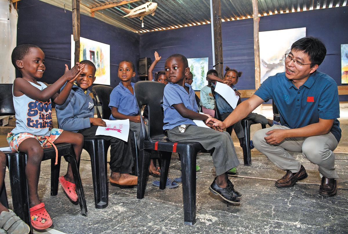 在納米比亞溫得和克的弗朗斯·南賓加藝術(shù)培訓(xùn)中心,一名中國(guó)醫(yī)療隊(duì)隊(duì)員向孩子們講解正確的洗手方法。(圖片/新華社)