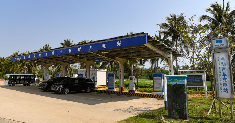 這是3月25日拍攝的博鰲零碳示范區(qū)內(nèi)的電動(dòng)汽車(chē)充電站。