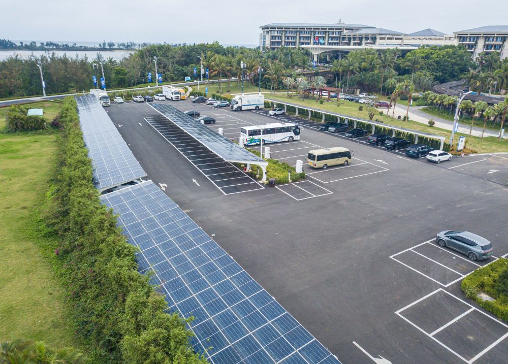 在博鰲零碳示范區(qū)拍攝的建有光伏發(fā)電設(shè)備的停車(chē)場(chǎng)(無(wú)人機(jī)照片,3月16日攝)。
