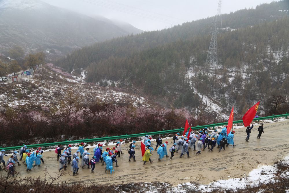 2021年,固原二中和弘文中學師生經歷了迄今為止最艱難的一次徒步:一路上雨雪交加,很多學生的鞋子被雨水泡濕,不時陷入泥潭,相互協(xié)助才能拔出;有些路段處處泥水坑,只能一步一步趟水前行,鞋子不時“呲呲”發(fā)聲;回程時由于下山道路實在泥濘難行,不得不臨時改變線路,沿著山頂返回,拉長路途……