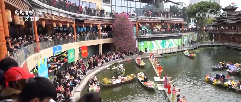 南寧民歌湖的民歌廣場是2025年廣西“三月三”的主會場。在水上主舞臺表演的是來自全國各地“四季村歌”歌隊的十幾個代表隊。2025年的廣西“三月三”主會場還有很多有意思的設置。比如,“有得花”鮮花市集、“有得?!笨萍汲蓖媸屑ⅰ坝械贸浴睎|南亞風情水上市集等。