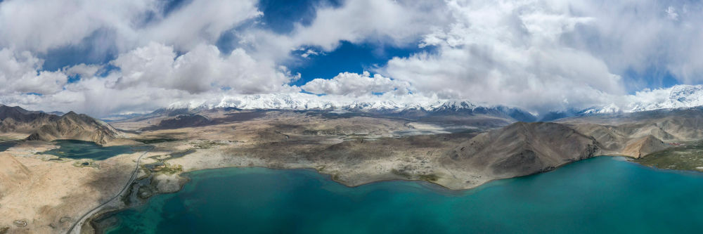新疆帕米爾高原上公格爾九別峰和慕士塔格峰山腳下的湖泊濕地景觀(2020年6月16日攝,無(wú)人機(jī)全景照片)。新華社記者 胡虎虎 攝