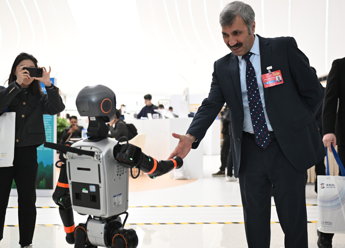 3月27日,與會嘉賓與一款加速T1機器人握手。(圖片來源:新華社)