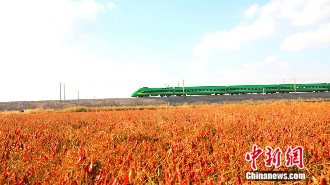 列車駛過新疆焉耆縣辣椒地。楊志榮 攝