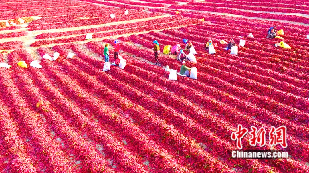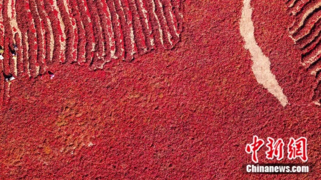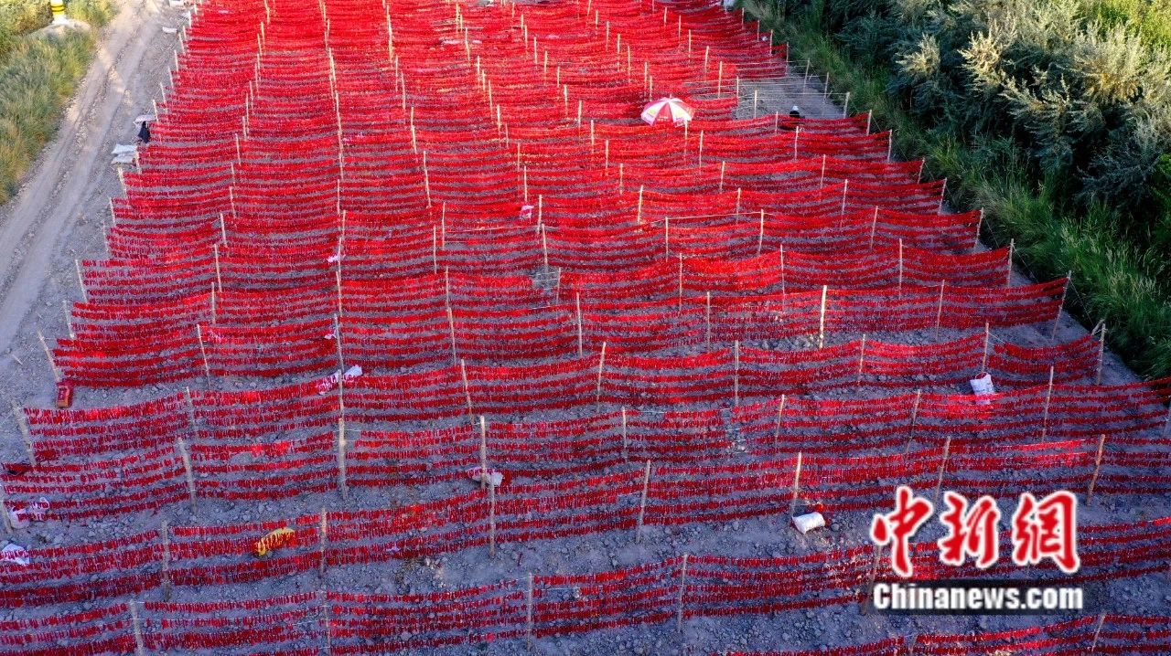 航拍焉耆縣焉耆鎮(zhèn)農民晾曬紅辣皮子。楊志榮 攝