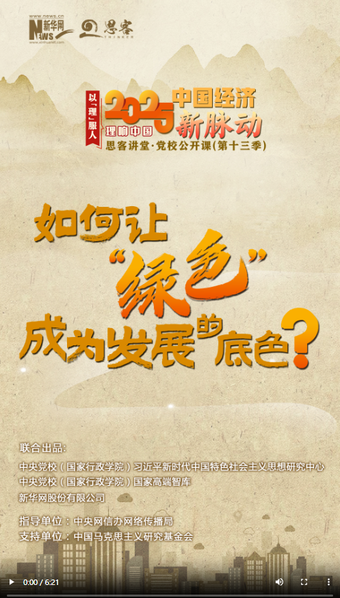 新一季“思客講堂·黨校公開課”《理響中國·以理服人|2025中國經(jīng)濟新脈動》,帶你讀懂2025年經(jīng)濟工作重點。藍天、碧水、凈土;節(jié)能、減排、降碳;生態(tài)優(yōu)先、綠色消費、零碳工廠……一個個生動的綠色畫筆,勾勒出高質(zhì)量發(fā)展的底色。綠色打底,發(fā)展更優(yōu)。怎么讓“綠色”成為發(fā)展的底色?如何激活全面綠色轉(zhuǎn)型的潛力?中央黨校(國家行政學(xué)院)社會和生態(tài)文明教研部副教授韓融給出了答案。