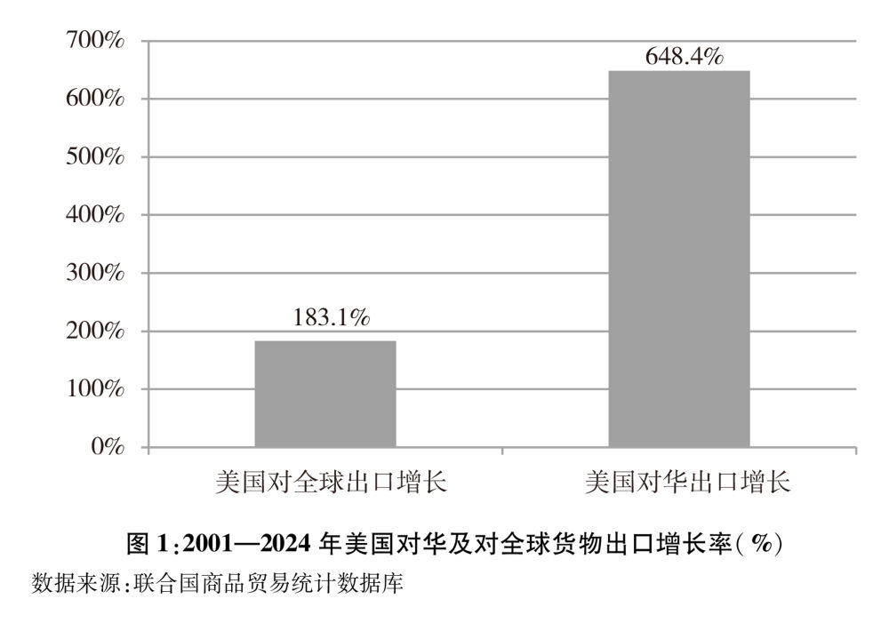 美國對華出口增速明顯快于其對全球出口。中國加入世界貿(mào)易組織以來,美國對華出口快速增長,中國成為美國重要的出口市場。根據(jù)聯(lián)合國統(tǒng)計數(shù)據(jù),2024年美國對華貨物出口額1435.5億美元,較2001年的191.8億美元增長648.4%,遠(yuǎn)遠(yuǎn)高于同期美國對全球183.1%的出口增幅(圖1)。