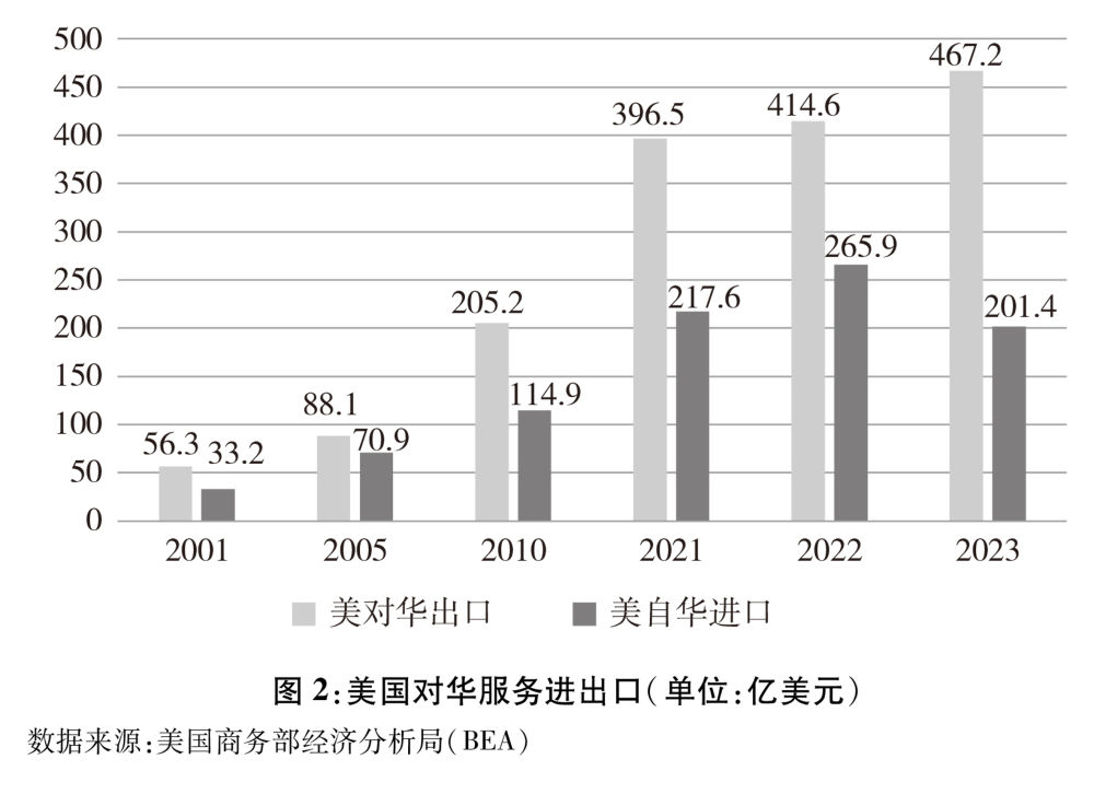 美國服務(wù)業(yè)產(chǎn)業(yè)門類齊全,具有較強(qiáng)國際競爭力??傮w來看,隨著經(jīng)濟(jì)不斷發(fā)展和人民生活水平提升,中國對服務(wù)需求明顯擴(kuò)大,中美雙方服務(wù)貿(mào)易快速增長。據(jù)美國商務(wù)部統(tǒng)計,2001-2023年,中美服務(wù)貿(mào)易額由89.5億美元擴(kuò)大到668.6億美元,增長了6倍(圖2)。根據(jù)中方統(tǒng)計,2023年,美國是中國第二大服務(wù)貿(mào)易伙伴;據(jù)美方統(tǒng)計,中國是美國第五大服務(wù)出口目的地。