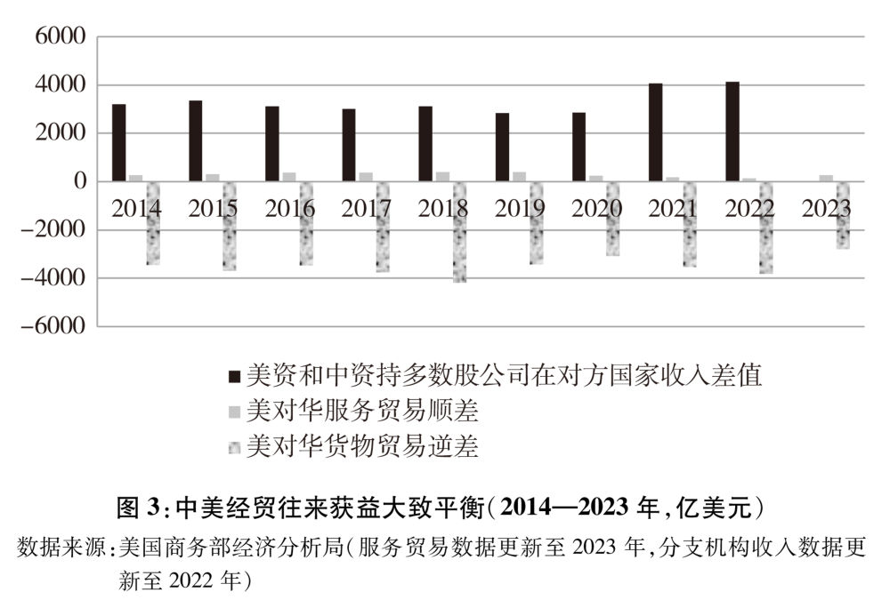 根據(jù)美國商務(wù)部數(shù)據(jù),2023年美國對華服務(wù)貿(mào)易順差為265.7億美元,美國在服務(wù)貿(mào)易方面占有顯著優(yōu)勢;2022年美資企業(yè)在華銷售額高達(dá)4905.2億美元,遠(yuǎn)高于中資企業(yè)在美786.4億美元的銷售額,差額高達(dá)4118.8億美元,美國企業(yè)跨國經(jīng)營優(yōu)勢更為突出。