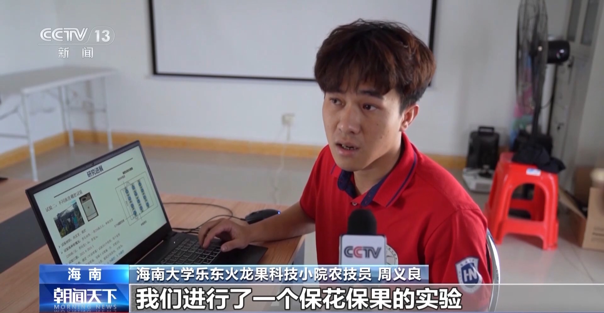 海南大學樂東火龍果科技小院農技員 周義良:根據(jù)這個現(xiàn)狀,我們進行了一個?;ū9膶嶒?,通過不同濃度的硼肥、氨基酸肥、授粉和溫度調控來進行實驗,坐果率提升了20%左右。