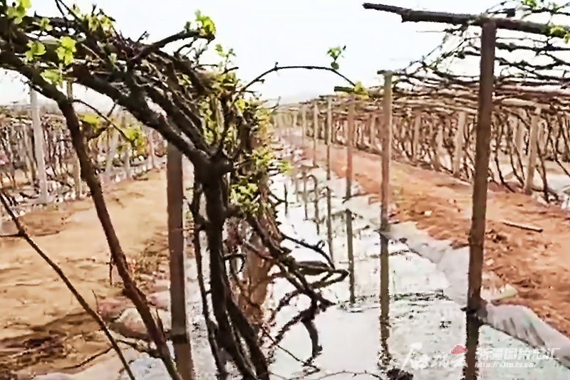 2022年,鄯善縣魯克沁鎮(zhèn)迪汗蘇村葡萄地在采用高效節(jié)水灌溉之前,大水漫灌的場(chǎng)景。熱杰甫·吐?tīng)栠d 攝