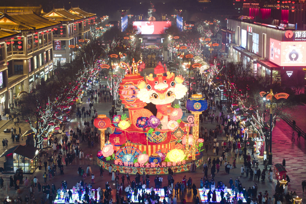 市民游客在西安大唐不夜城游玩、消費(1月22日攝,無人機(jī)照片)。新華社記者 邵瑞 攝