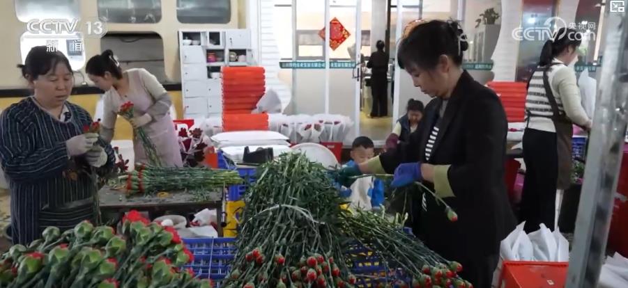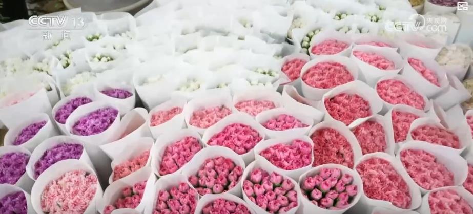 在昆明一家花卉貿(mào)易公司,記者看到,工人們正加班加點(diǎn)對剛剛集中采購回來的康乃馨進(jìn)行二次分級(jí)包裝。