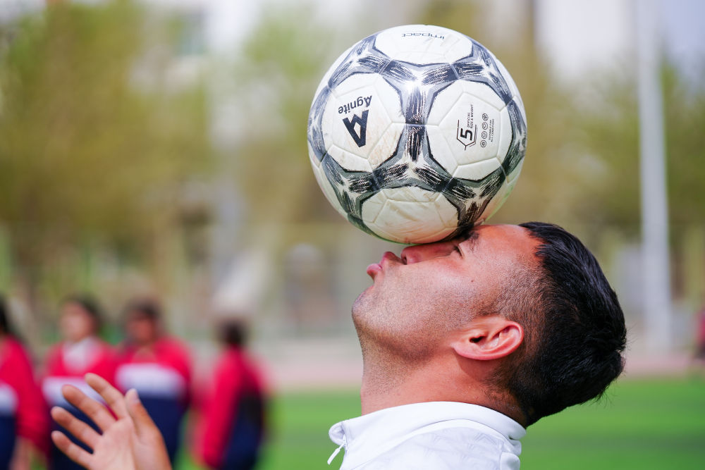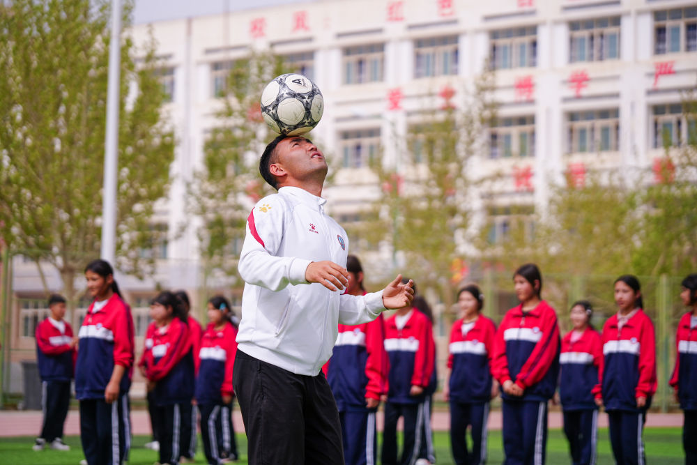 ↑4月14日,在阿圖什市硝魯克中學(xué),教練如扎吉為隊(duì)員演示頭部停球。新華社記者 徐宏巖 攝