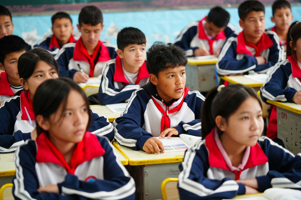 ↑4月14日,在阿圖什市硝魯克中學(xué),球隊(duì)前鋒謝爾克努爾·亞力坤(二排左二)在教室里上課。新華社記者 徐宏巖 攝