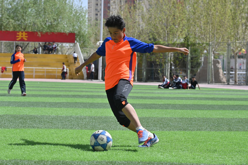 ↑4月10日,在阿圖什市硝魯克中學(xué),球隊(duì)中場(chǎng)球員帕提麥·肉孜買(mǎi)買(mǎi)提(左)在進(jìn)行運(yùn)球訓(xùn)練。新華社記者 徐宏巖 攝