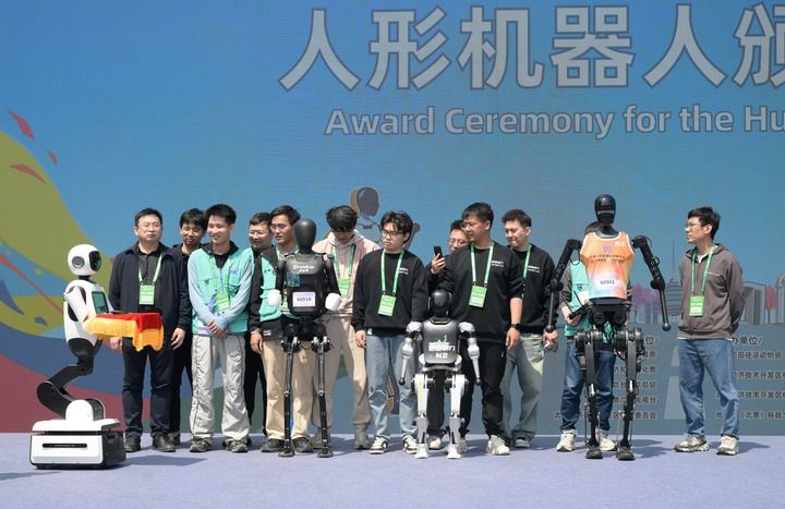 2025年4月19日,一臺機(jī)器人在人形機(jī)器人頒獎儀式上托舉著獎牌走向獲獎機(jī)器人選手和技術(shù)團(tuán)隊。當(dāng)日,2025北京亦莊半程馬拉松暨人形機(jī)器人半程馬拉松舉行。新華社記者 李賀 攝