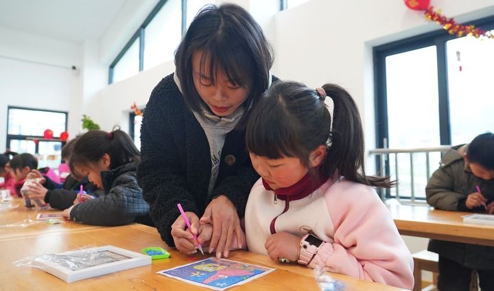 2月21日,重慶市豐都縣包鸞鎮(zhèn)“鸞媽媽”青少年家庭教育互助會志愿者在輔導(dǎo)孩子制作鉆石畫。豐都縣委宣傳部提供。