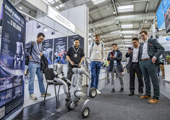 2025年4月1日,在德國(guó)漢諾威工業(yè)博覽會(huì)上,人們?cè)谟顦?shù)科技展區(qū)觀(guān)看機(jī)器狗演示。新華社記者 張帆 攝