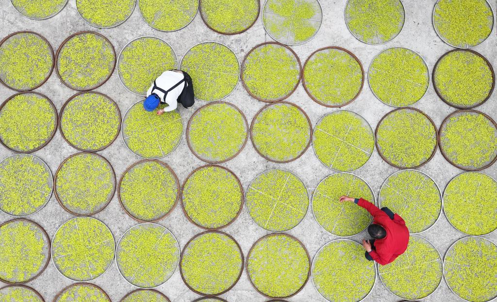 4月7日,在湖南省永州市雙牌縣上梧江瑤族鄉(xiāng)盤家村云臺(tái)山生態(tài)有機(jī)茶園,茶農(nóng)在攤曬春茶(無人機(jī)照片)。新華社發(fā)(何紅福攝)